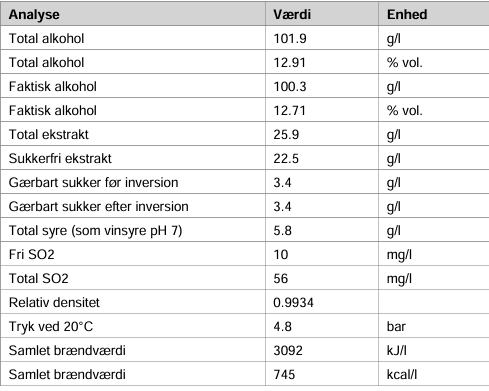 Samlet alkohol (beregnet): 104,2 g/l